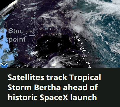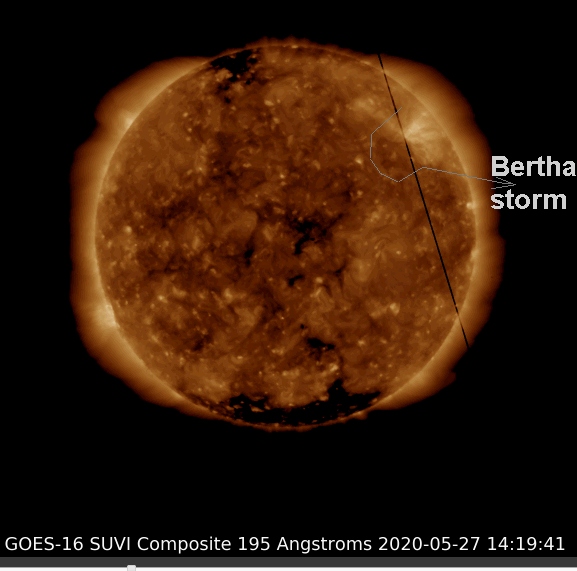 Image of the Bertha storm at Earth and marked point at the Sun are very similiar, lighted and darked marked parts.