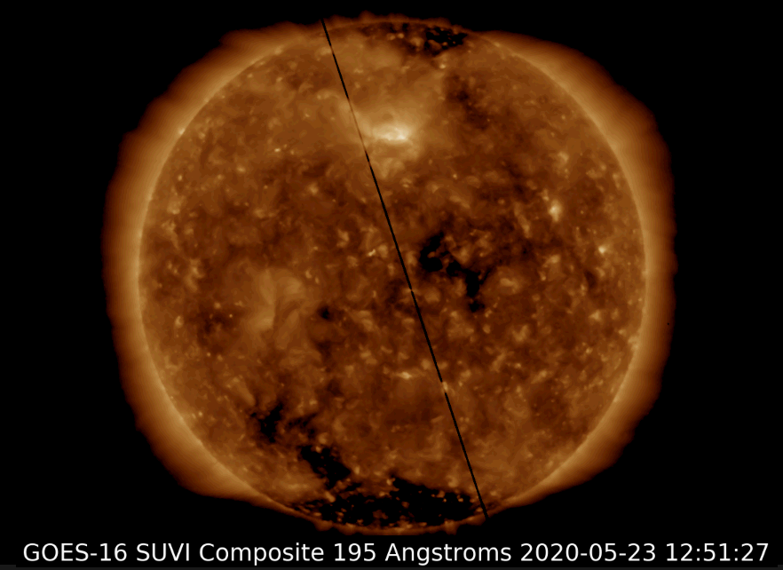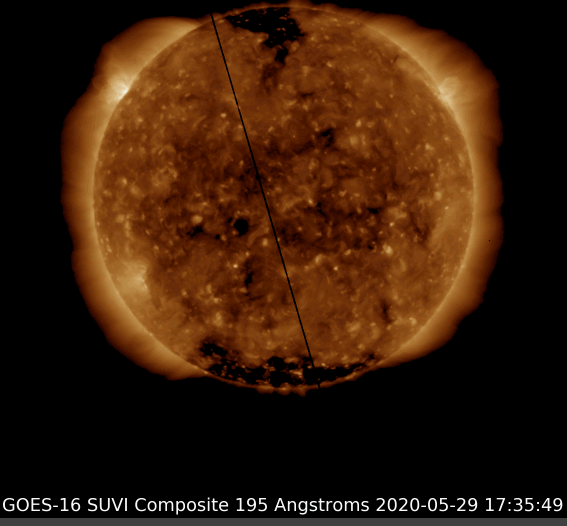 Vertical black line across Sun is the Black hole ring above Sun, which now went bellow Sun. How I knew it goes on the right, bellow! Because Sun spins from right to left and black hole puls from left to right, so black line passes Sun quickly captured at one image only, this one.